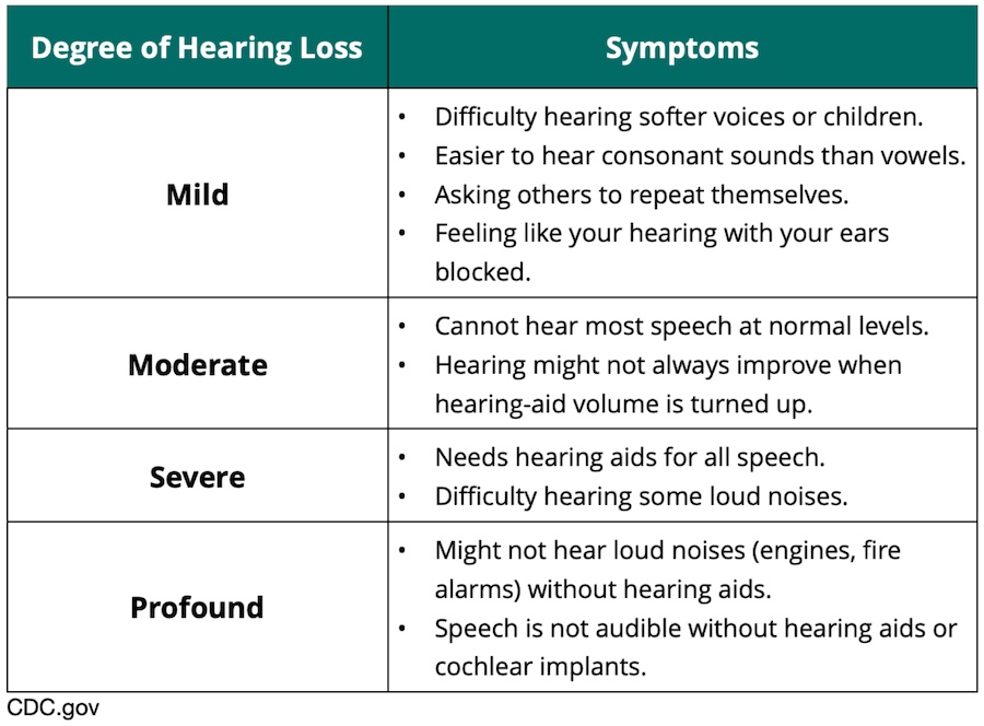 The following table outlines the four degrees of hearing loss by their symptoms.