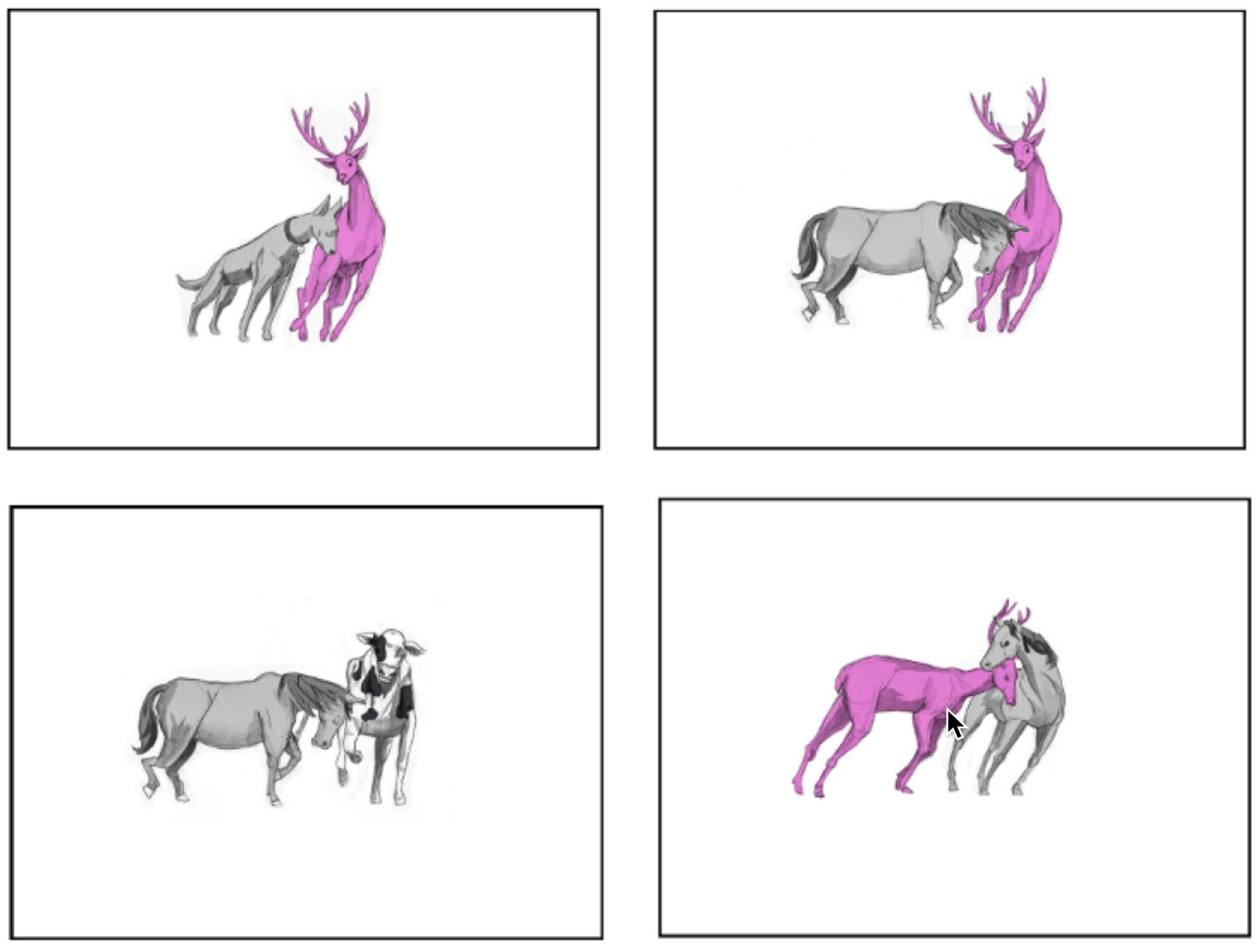 Figure 1: Example of a sentence from the low cognitive demand condition (superfluous premodifying adjectives). Target (spoken sentence): “The small gray horse bumps the tall pink deer.”