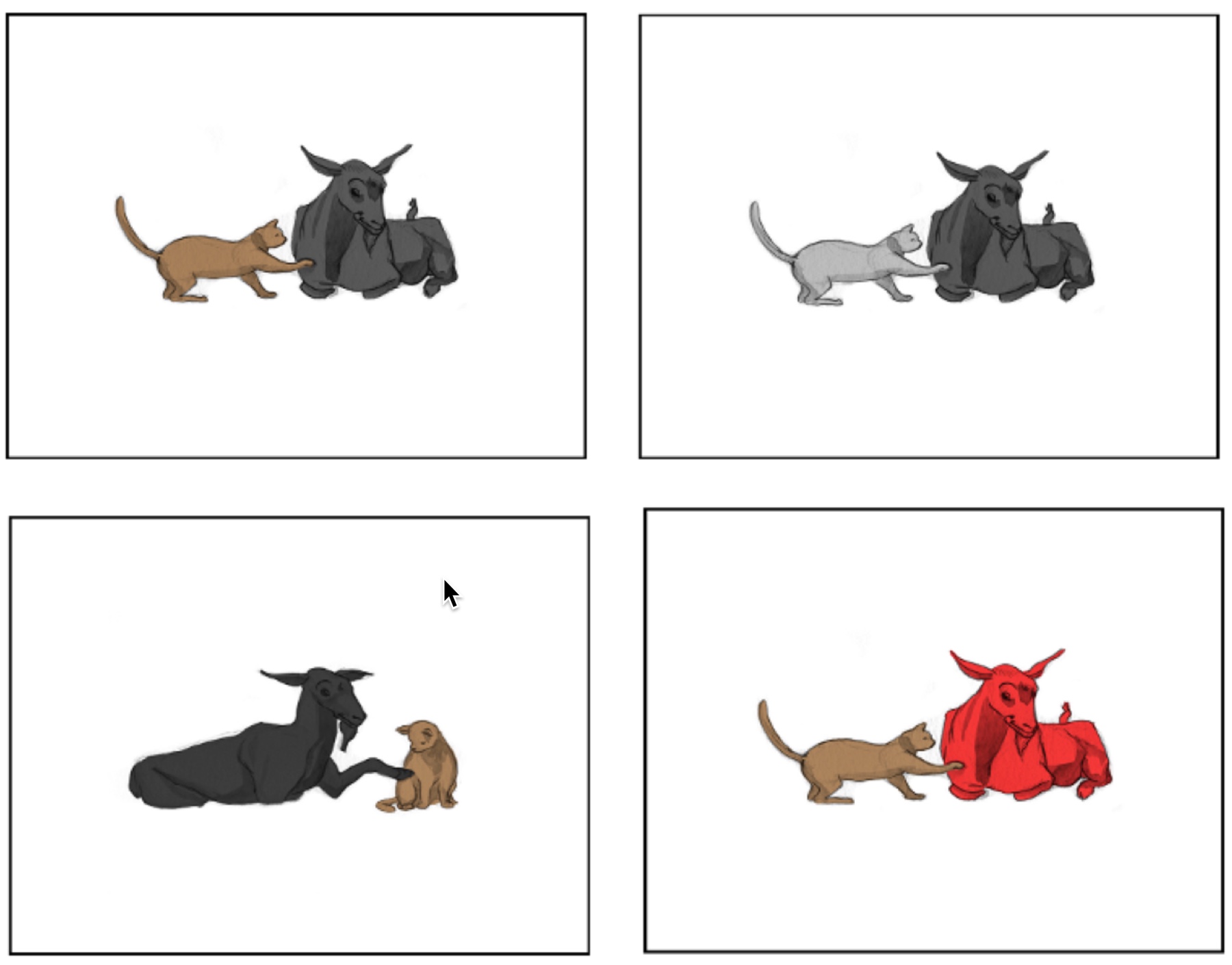 Figure 2: Example of a sentence from the high cognitive demand condition (contrastive premodifying adjectives). Target (spoken sentence): “The little brown cat pokes the happy black goat.”