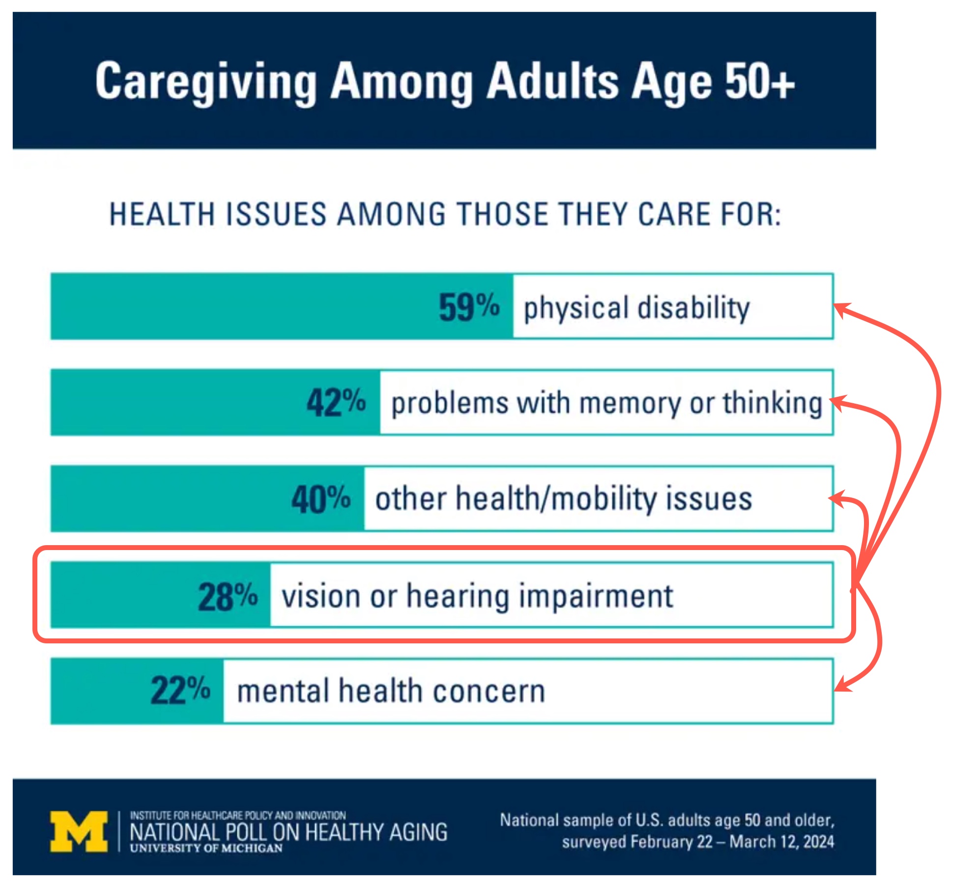 - Hearing loss is connected to the health issues the University of Michigan poll identified.