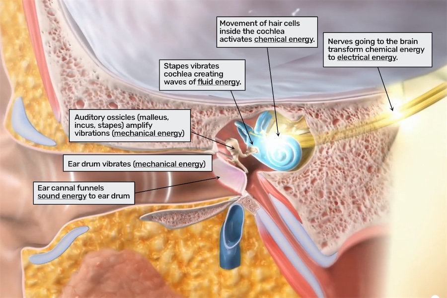- 💥 Electrical energy: Nerves connecting the cochlea with the temporal lobe of your brain convert the chemical energy to electrical energy resulting in neural signals flowing to your brain.