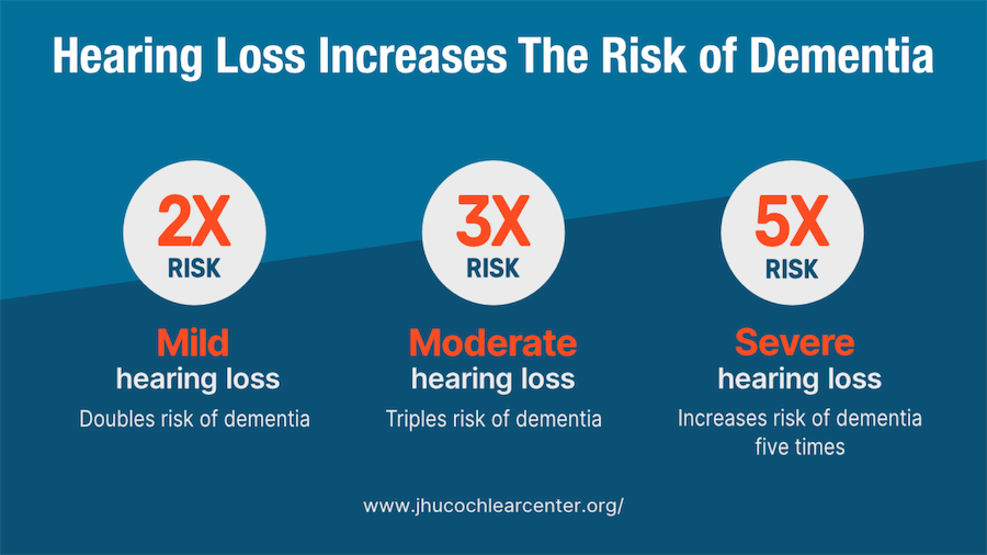 - The graphic below shows the relationship between hearing loss and the increased risk of dementia that Johns Hopkins researchers reported.