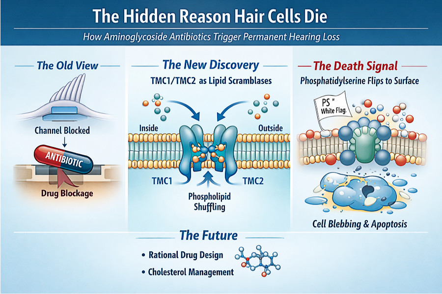Membrane cholesterol directly modulates scramblase activity. That finding means the mechanism isn't locked — it responds to its environment. Researchers suggest diet or cholesterol management could someday act as a protective buffer against both ototoxic medications and genetic hearing loss. A systemic intervention for what has always seemed like a purely structural problem.