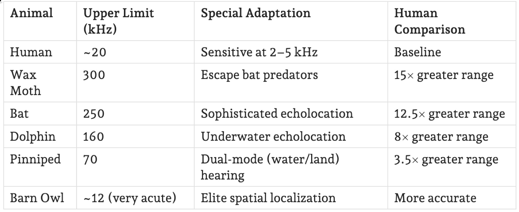 Master of frequency: The greater wax moth takes the crown for frequency range—it hears up to 300 kilohertz, about 15 times higher than humans’ upper limit of ~20 kHz. That lets it detect hunting bats before it’s too late.