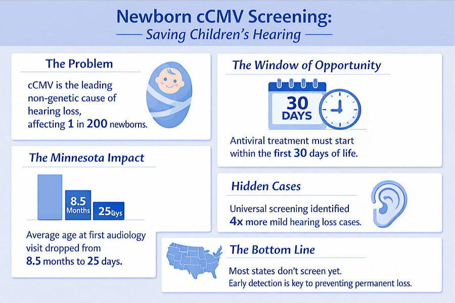 Minnesota ran a groundbreaking experiment on newborn screening for congenital cytomegalovirus (cCMV), a viral infection that can cause hearing loss in infants. A new study confirms advocates’ long-held belief: the most at-risk children were not those with severe symptoms, but many with subtle, overlooked, mild hearing impairments.