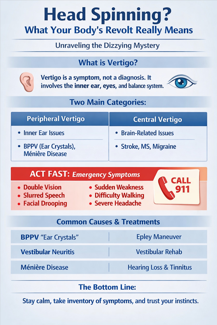 Most vertigo resolves. Some is a medical emergency. If the room is spinning, observe your symptoms closely. Double vision, slurred speech, or sudden weakness, get medical help immediately.