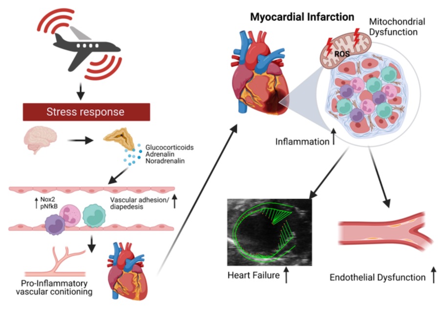Aircraft noise causes the body to release stress hormones, leading to an inflammatory response in the blood vessels, increasing the risk of myocardial infarction (MI).