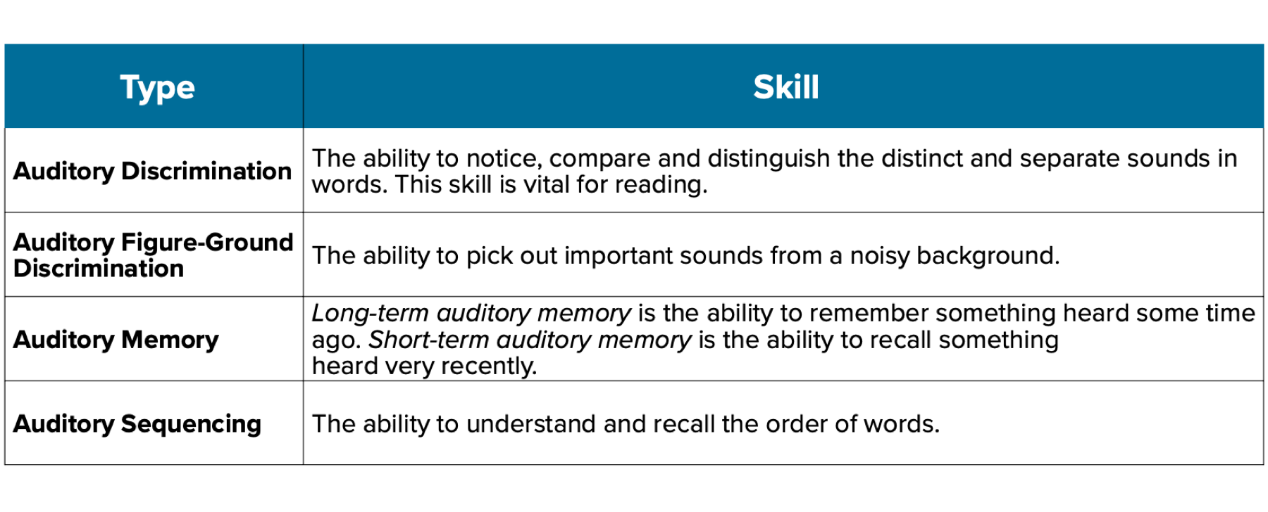 When you discuss your child's APD with your audiologist, you may hear the terms presented in the table below.