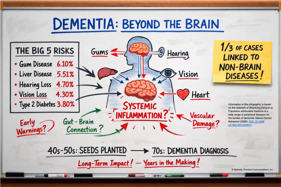 This research reframes dementia as a whole-body disease. The implication: your 50-year-old heart, liver, and gums matter as much as your 70-year-old brain.