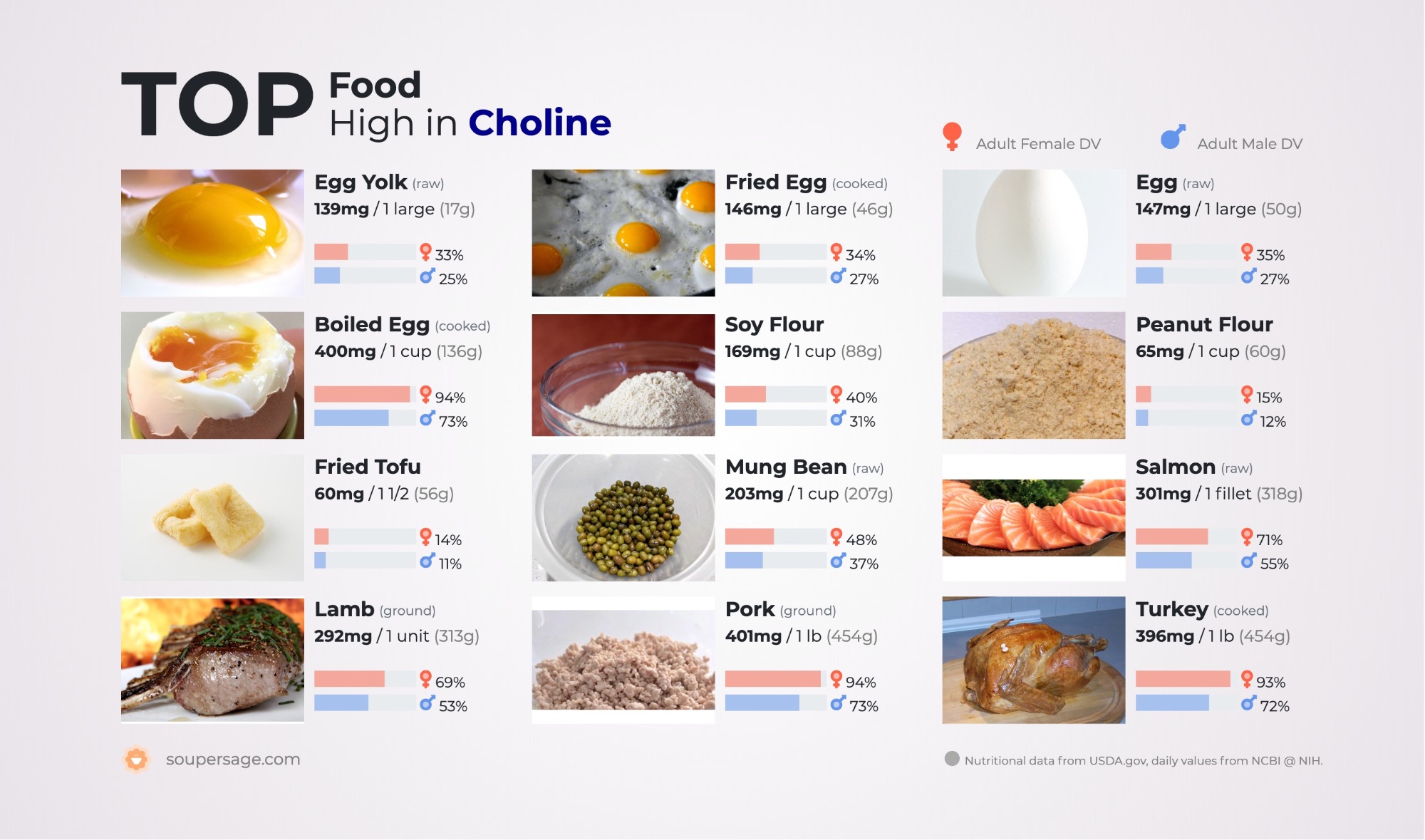 - Beef: A 3-ounce serving of lean beef provides about 117 mg of choline.