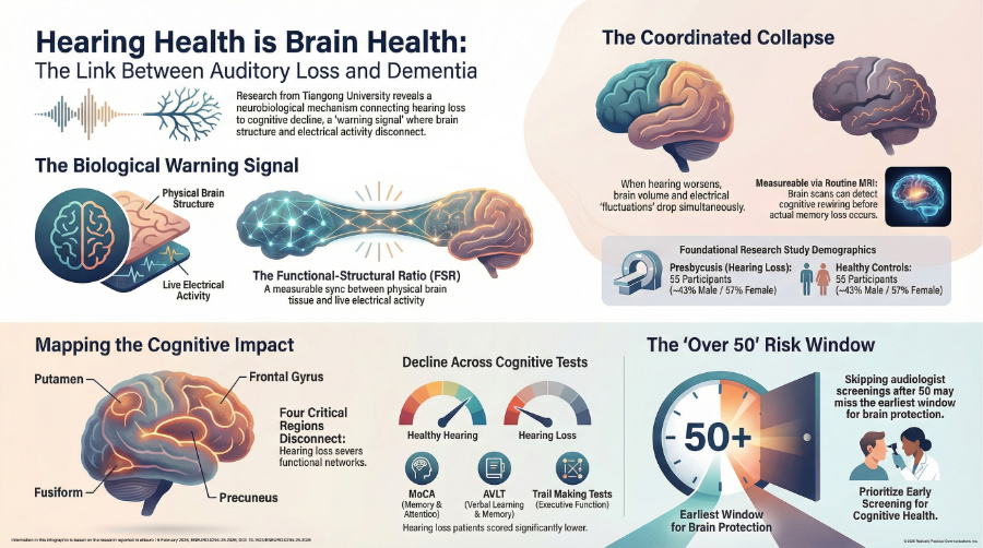 Researchers at Tiangong University and Shandong Provincial Hospital have identified a neurobiological mechanism, the Functional-Structural Ratio (FSR), linking age-related hearing loss to cognitive decline. This isn't a theory: the evidence shows up on brain scans.