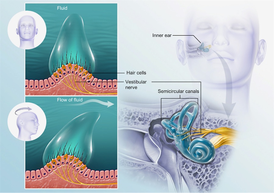 - When we move our heads, fluid in the semicircular canals, utricle, and saccule bend hair cells, producing sensory information, which travels to the brain by the vestibulocochlear nerve.