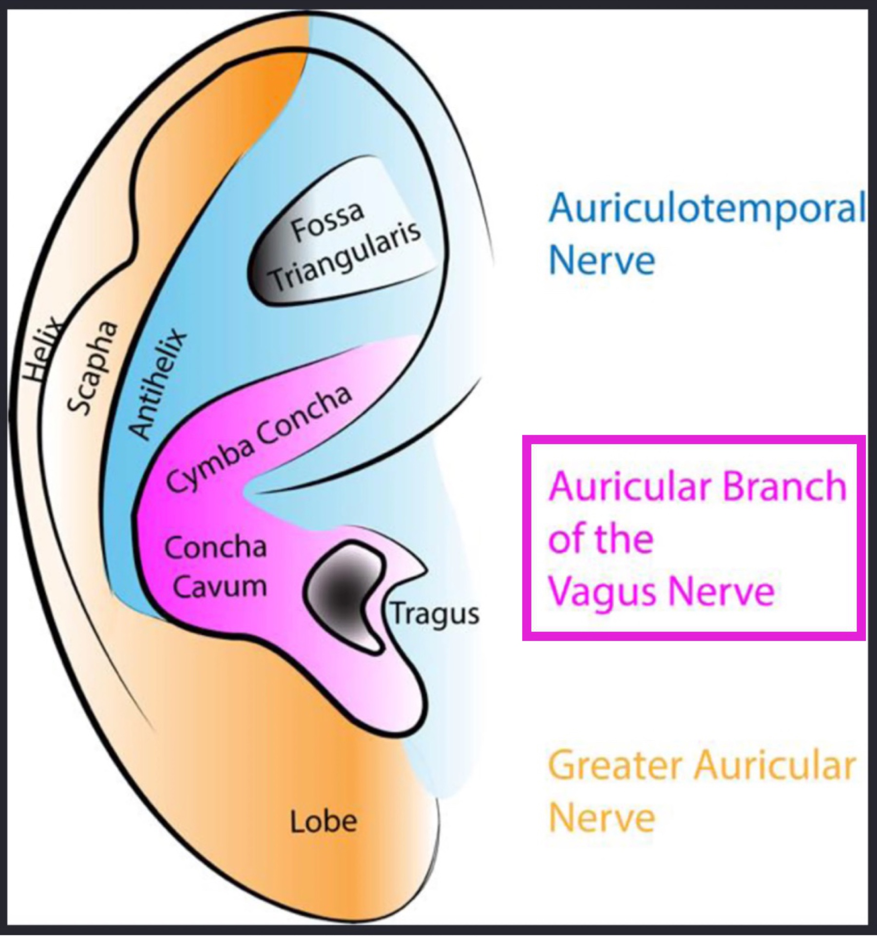 tVNS is given through the skin over the auricular branch of the vagus nerve, seen in magenta. Diedrich, A et al. (2021)