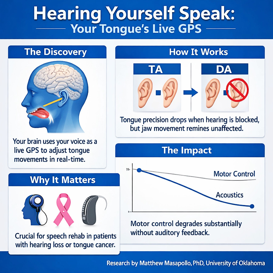 Researchers have kinematic evidence that auditory feedback governs tongue movement during speech, not just sound quality. This changes how clinicians approach speech rehabilitation for patients with hearing loss, cochlear implants, and tongue cancer.